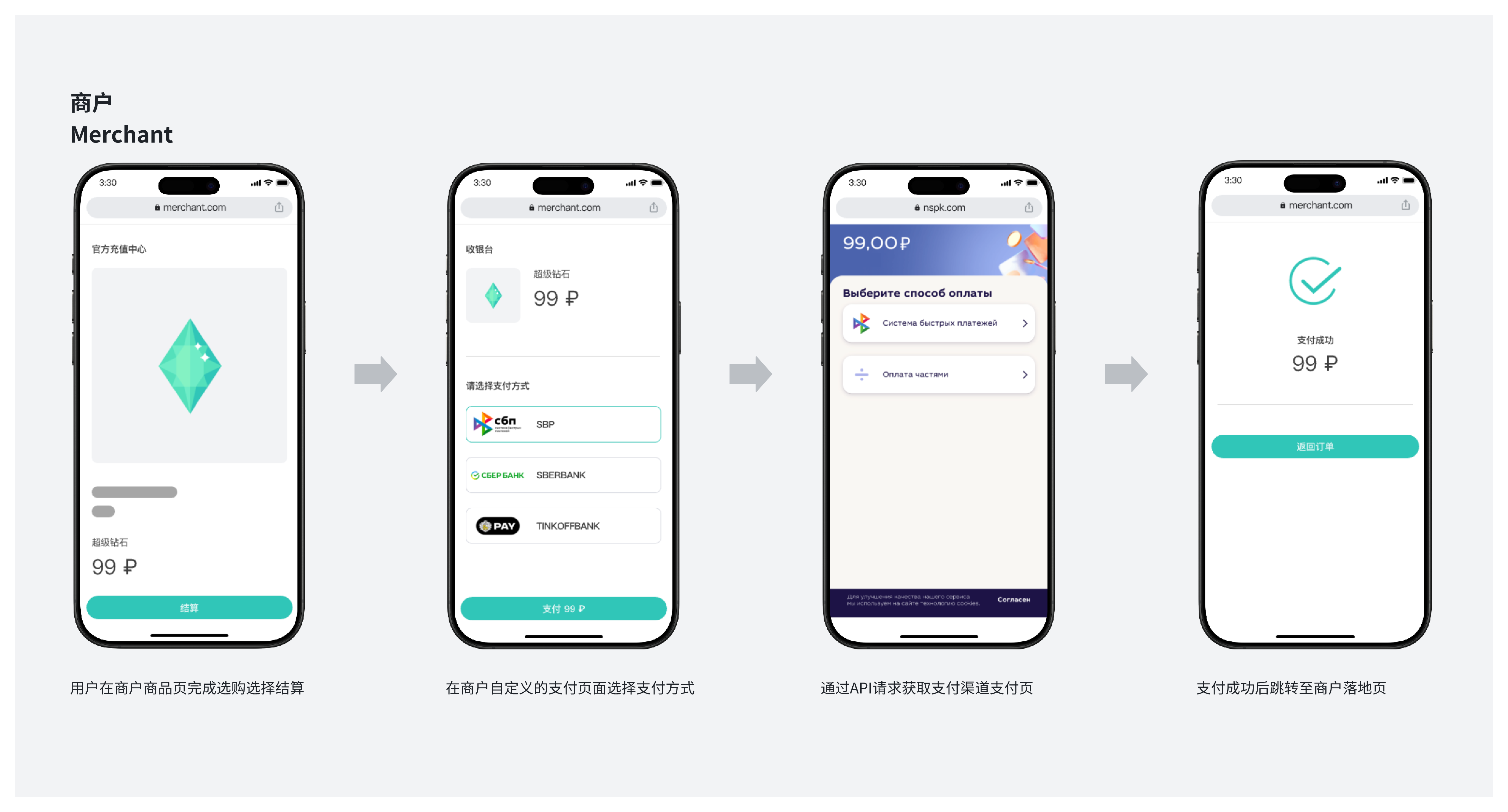 用户在您的网站完成商品选购后,在收银台选择支付方式并提交支付请求。随后,您通过 Checus API 发起支付流程。