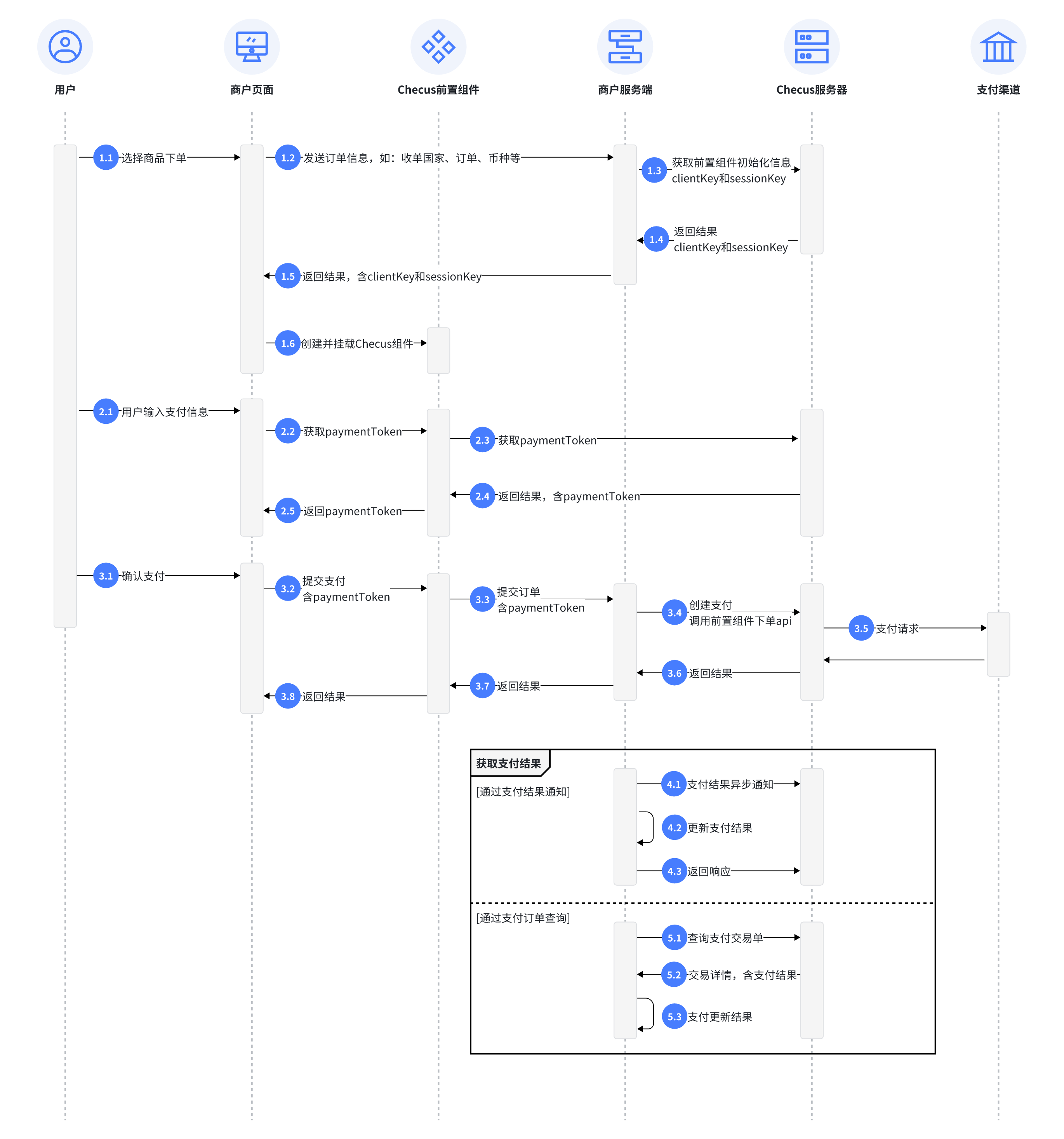 | 3.4 创建支付,调用前置组件下单接口 | 商户->Checus | 后端接口 | /orderAndPay |