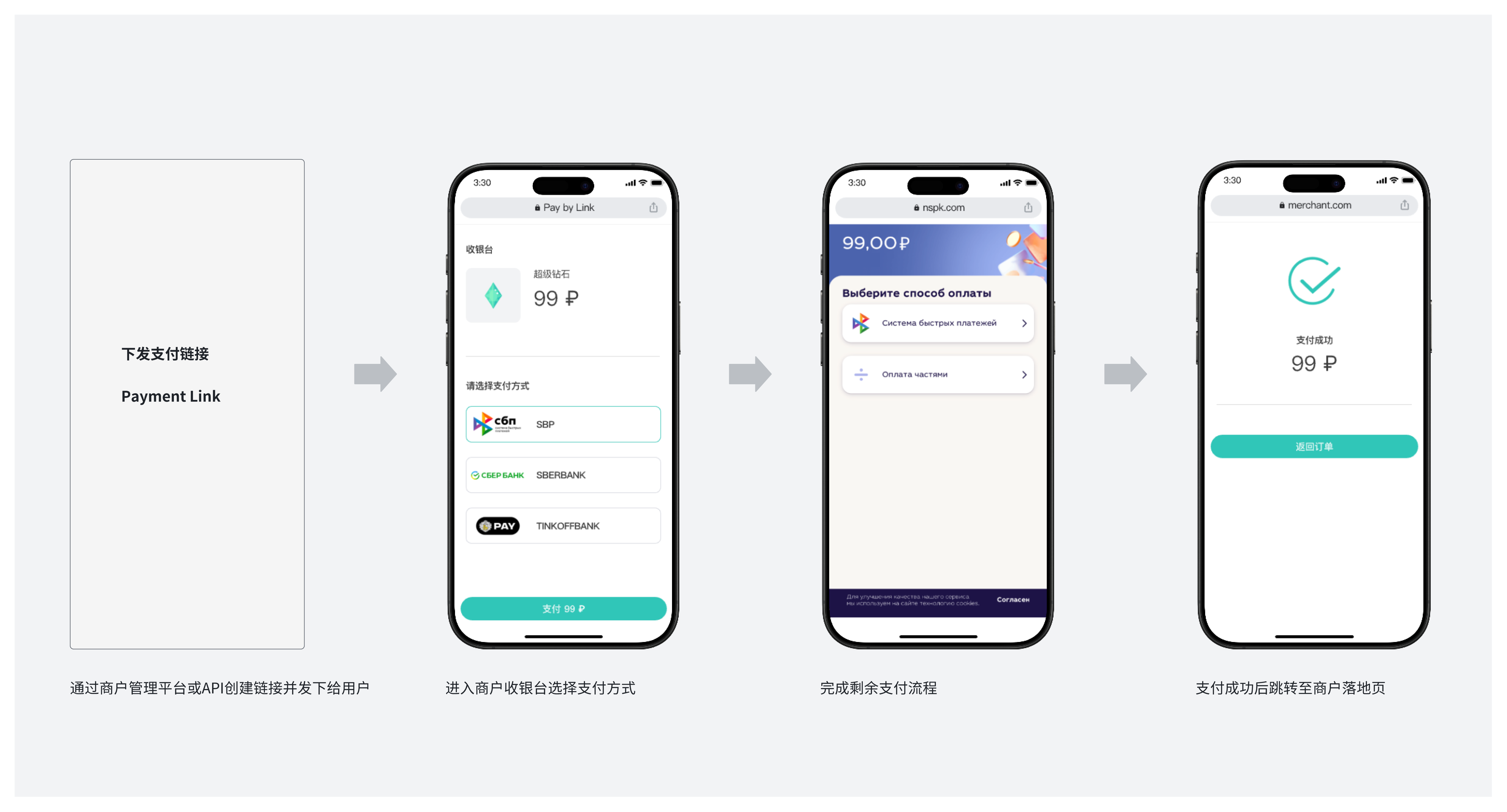 用户访问商家提供的链接(直接点击或扫码二维码)后,将进入商品详情页,点击“结算”跳转至收银台,选择支付方式并完成支付,随后查看支付结果页面。
