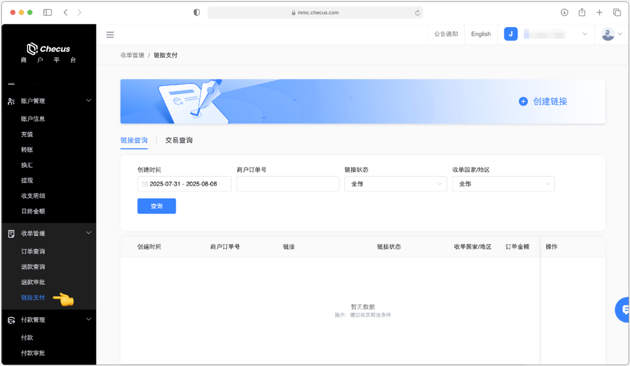 路径:'收单管理' > '链接支付' > '创建链接'