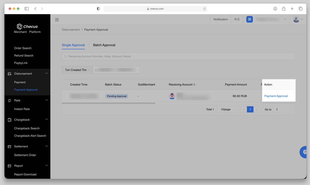 Navigate to 'Disbursement' > 'Payment Approval' and click Single Approval to access the pending approval list.