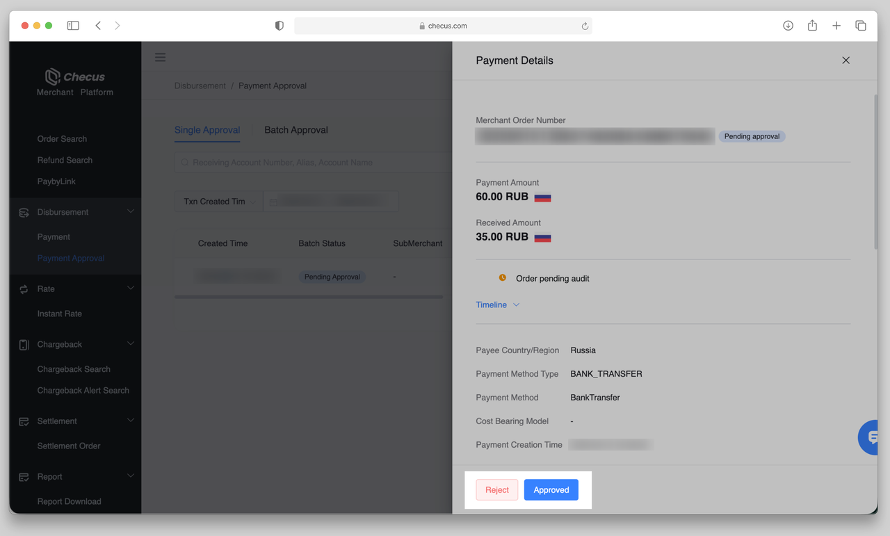 | Pending Approval | The payout order has been submitted and is waiting for review by an operator with approval authority | Approve / Reject |