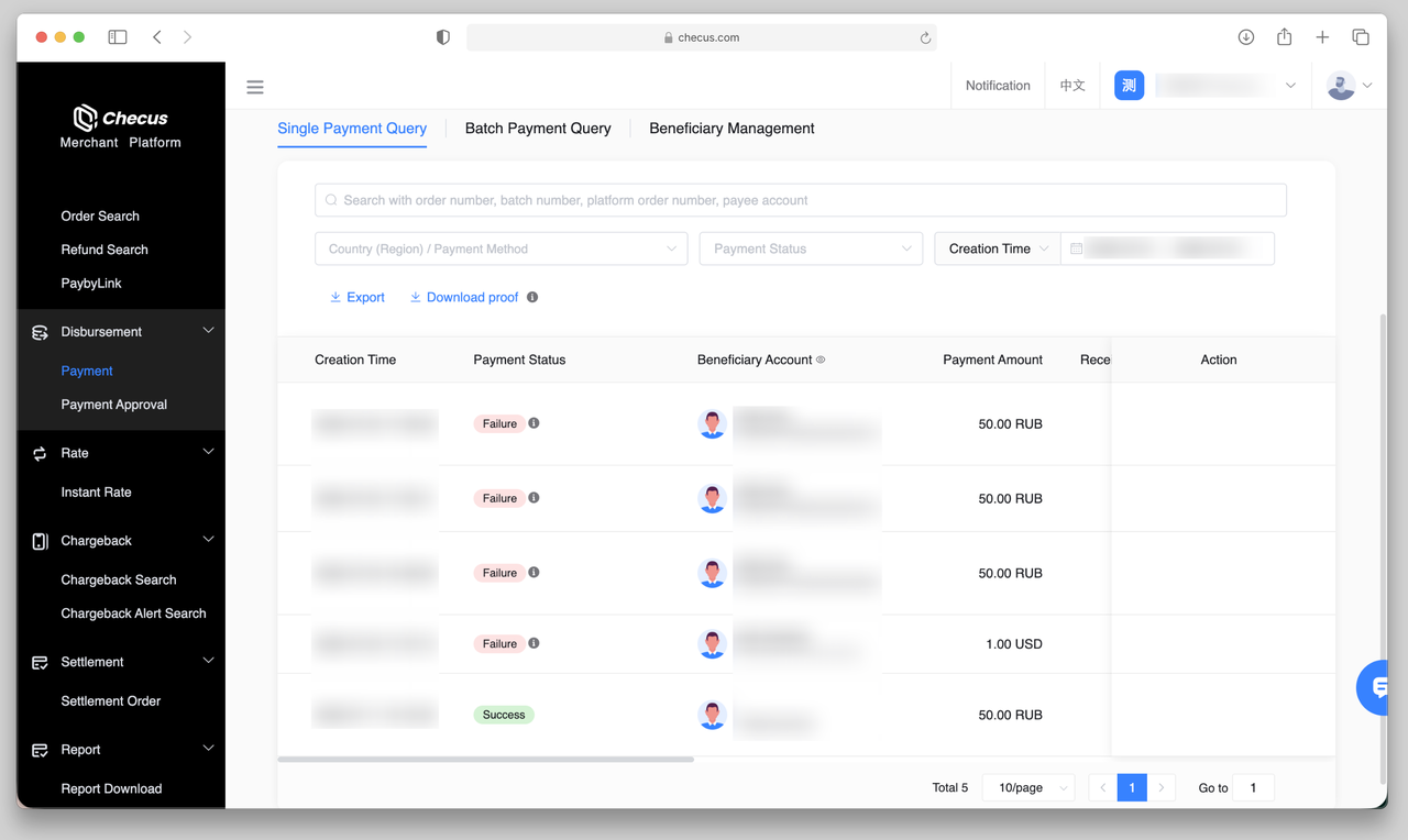 | Failed | The payout was rejected during approval or failed; failure/rejection reasons can be viewed in the detail page | Download Payout Receipt |