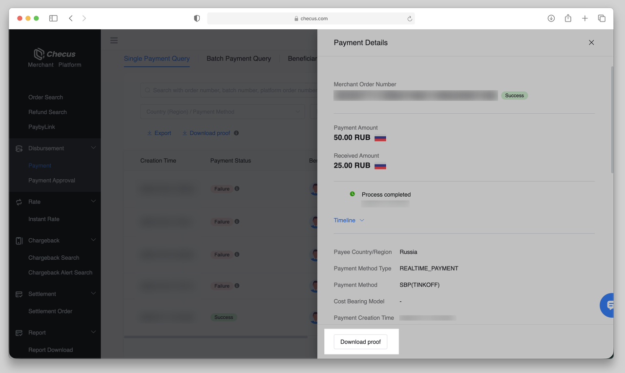 After a payout is approved, enter the detail page and click the Download Proof button to obtain the complete proof for that payout.
