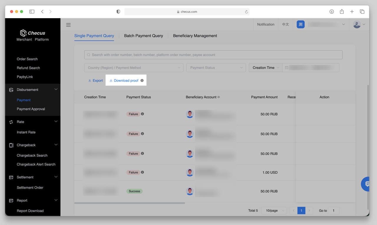 The payout inquiry list also supports batch operations: click Download Proof in the list to download all approved payout proofs in bulk.
