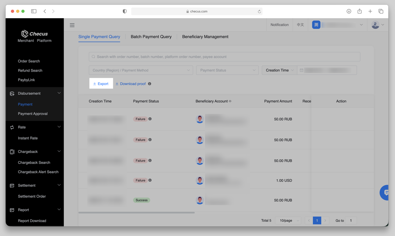 Click the Export button on the payout inquiry list to export all payout records within the current query range, covering payouts in all statuses.