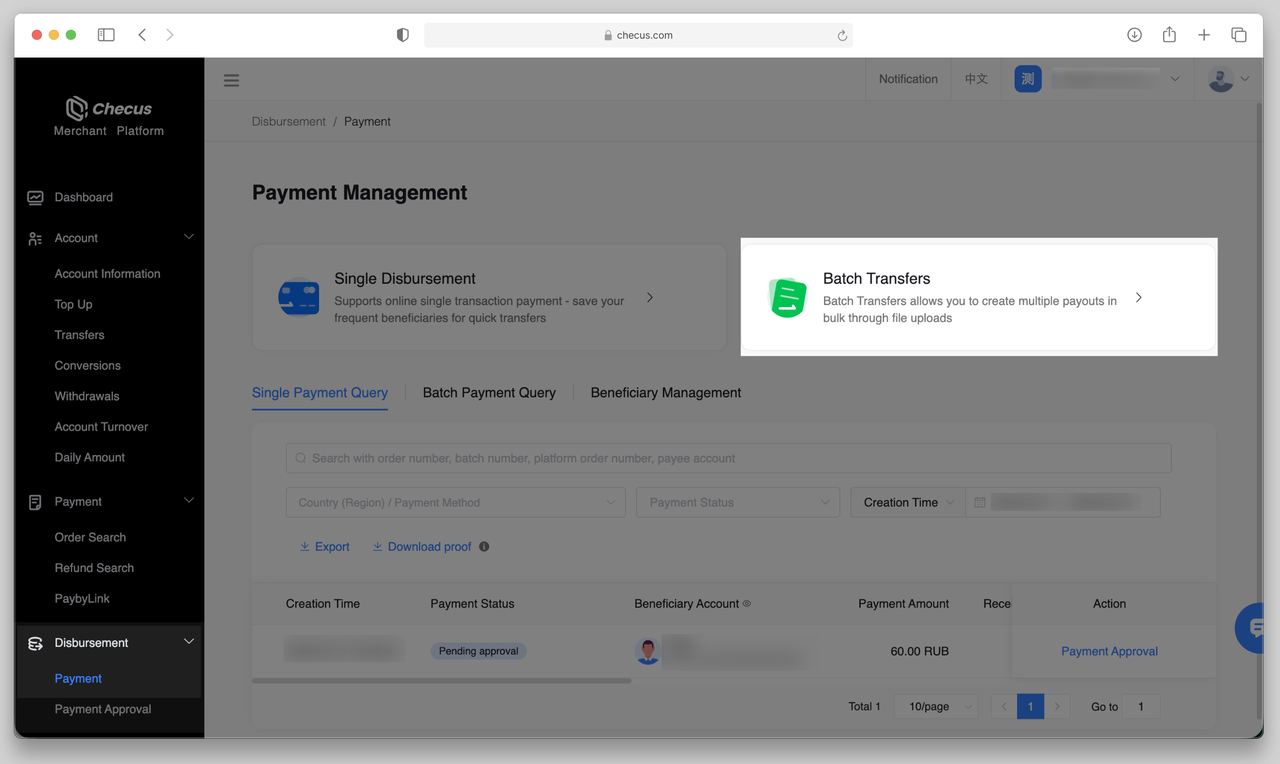 Query Path: 'Disbursement' > 'Payment' , click Single Payout Inquiry to view all payout transaction records.