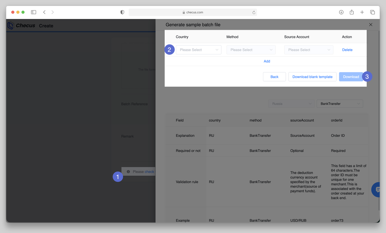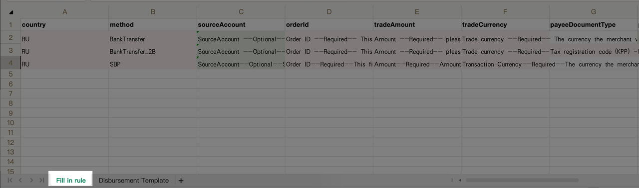 Click check the template and select the payout country, payment method, and debit currency based on your needs. The system will provide an Excel template for you to fill out.