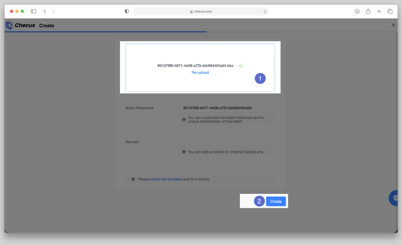 After filling in the template, upload the file. The system will automatically generate a batch number and validate the content. You can add payout remarks as internal identifiers, then click Create.