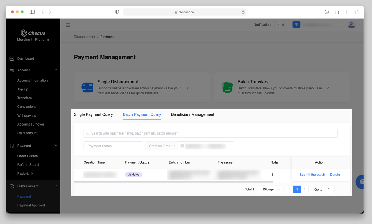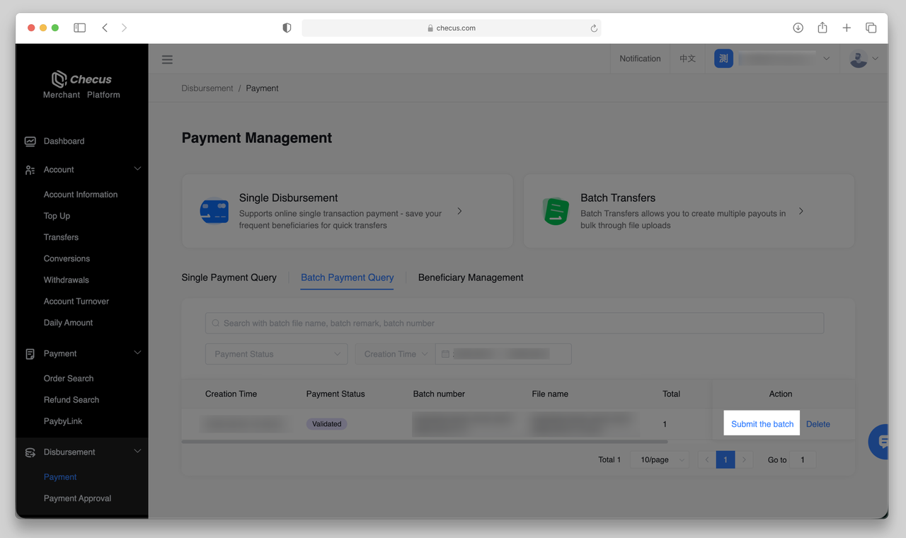 After successful validation, click Submit the Batch on the Batch Inquiry page to initiate payouts. The system will automatically process successfully parsed orders, while failed ones will be ignored. Any failed items can be corrected and re-uploaded as prompted.