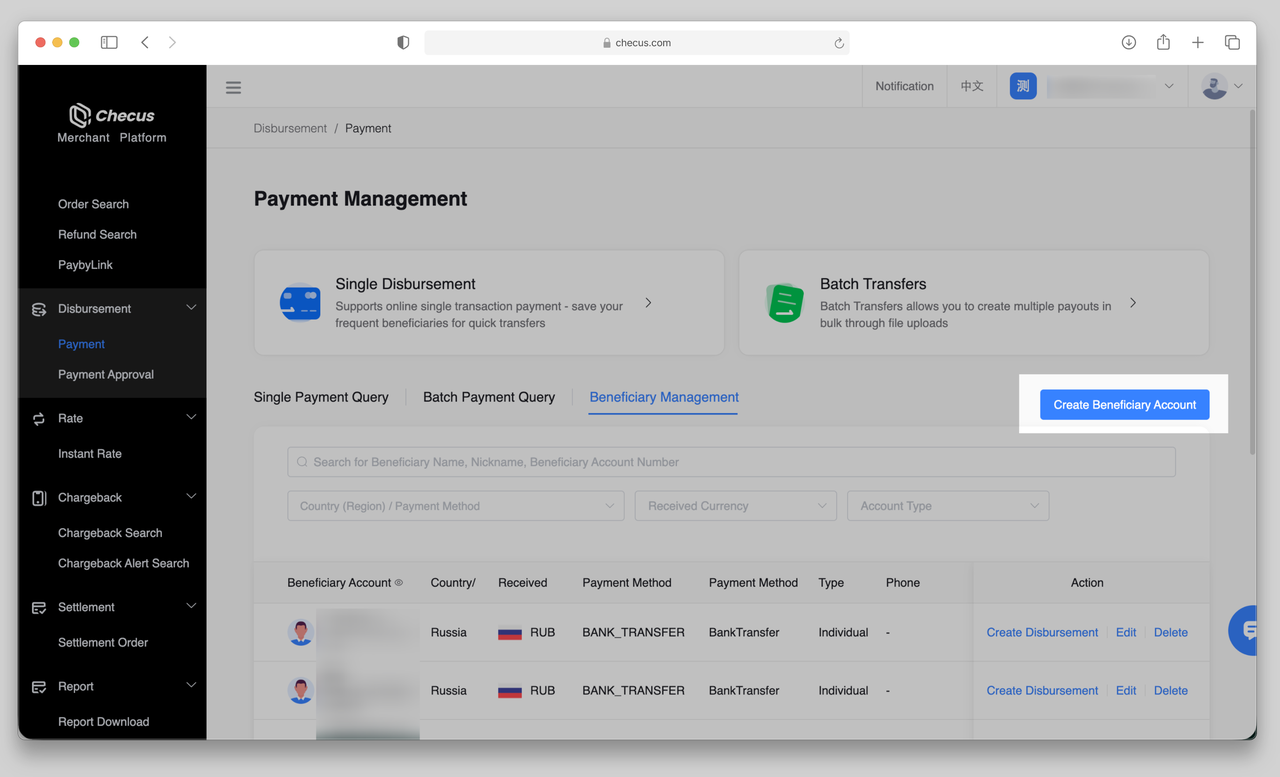 - Go to 'Disbursement'>'Payment', switch to'Beneficiary Management', and click the Create Beneficiary Account button.
