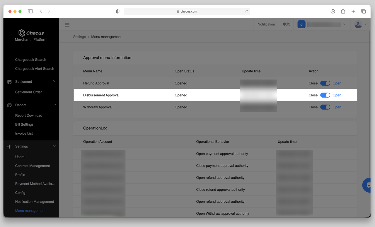 - In 'Settings'>'Menu Management', you can toggle whether to enable Disbursement Approval. This setting applies to both single and batch payouts, and the system enables the approval workflow by default.