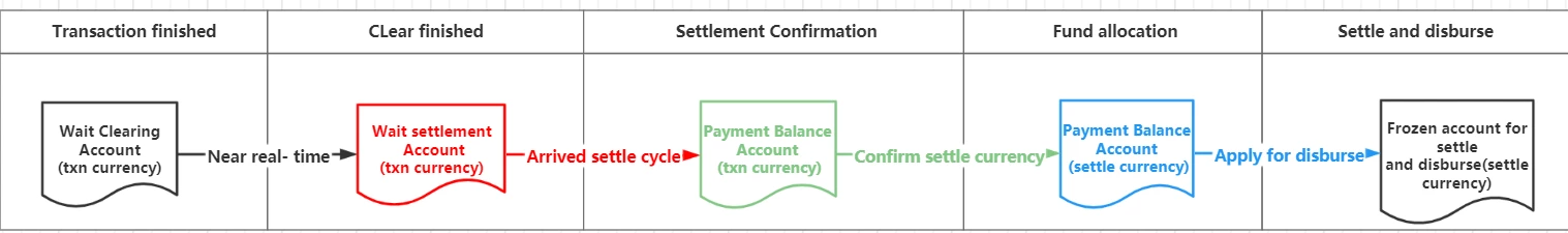 - After reaching the settlement cycle: Funds transfer from the pending settlement account to the incoming balance account (transaction currency) —————— (merchant's pending settlement account and collection balance account balance increase/decrease equally)