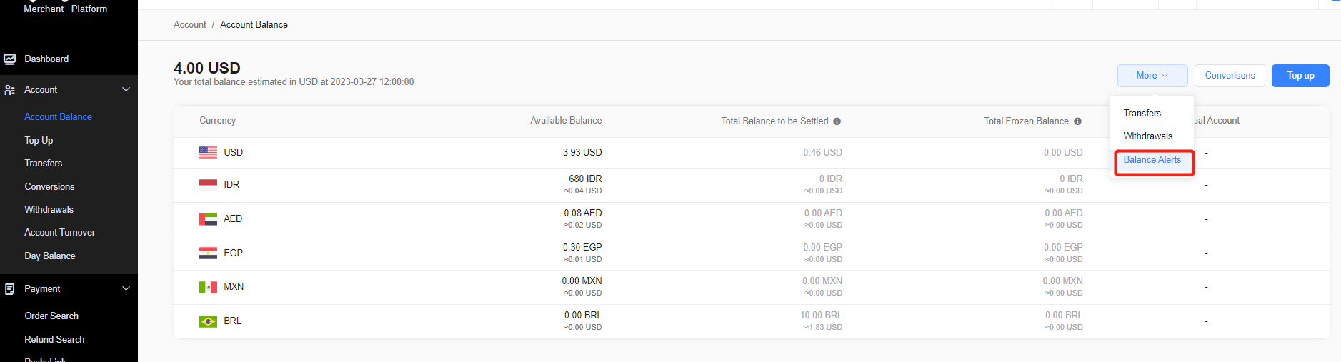Merchants can use the [Balance Alert] function to prevent affecting payment business due to untimely top-up. Enter the merchant platform "Account Management" - "Account Balance" - "Balance Alert" to configure balance warning rules. When your account balance is less than or equal to the warning value, Checus will send an email notification. Regarding "Balance Alert", the warning amount only includes available balance and is a warning for each currency account amount, not for the total account balance.