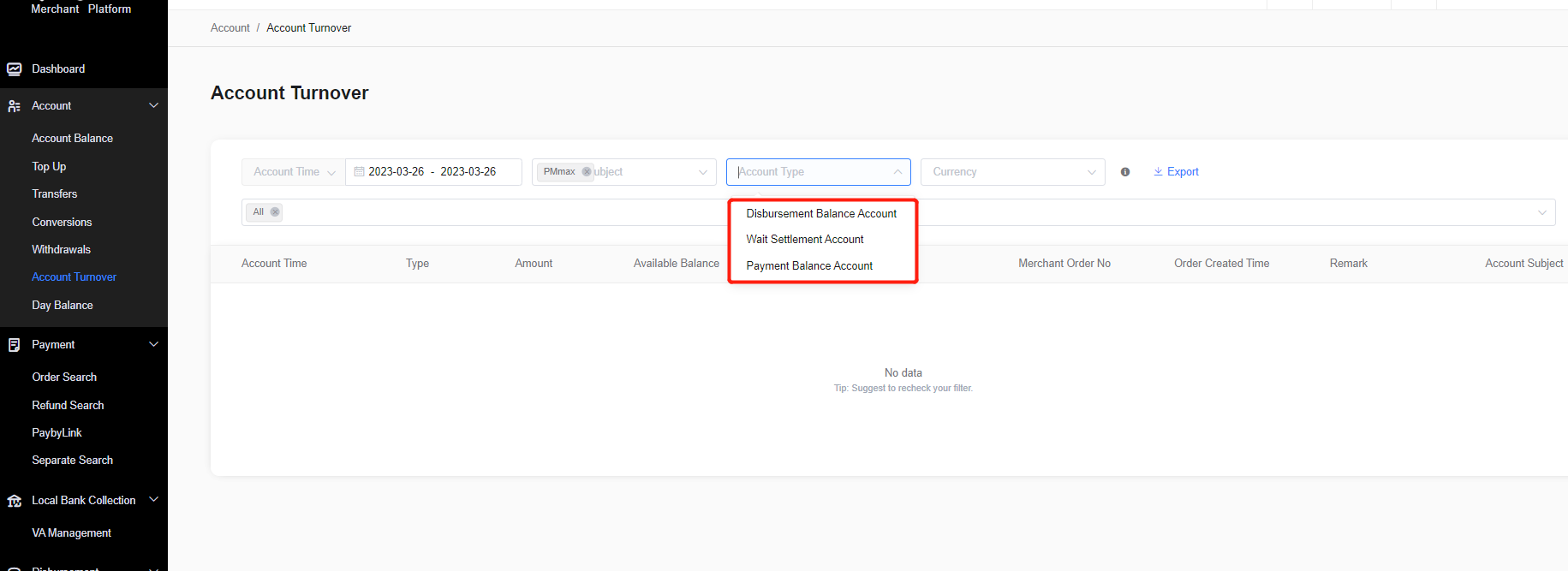 The merchant's income and expense details (path: MMC-Account Management-Income and Expense Details) involve fund movements in the following three accounts: pending settlement account, collection balance account, and payment balance account.  **Pending Settlement Account:** The amount after deducting handling fees and taxes from collection transactions. It can only be settled after reaching the settlement cycle (corresponding to the merchant's pending settlement account in the underlying logic) **Collection Balance Account:** Funds that have reached the settlement cycle and transferred from the pending settlement account to the collection balance account (corresponding to the incoming balance account in the underlying logic) **Payment Balance Account:** Funds obtained from merchant top-up or collection transfer to top-up