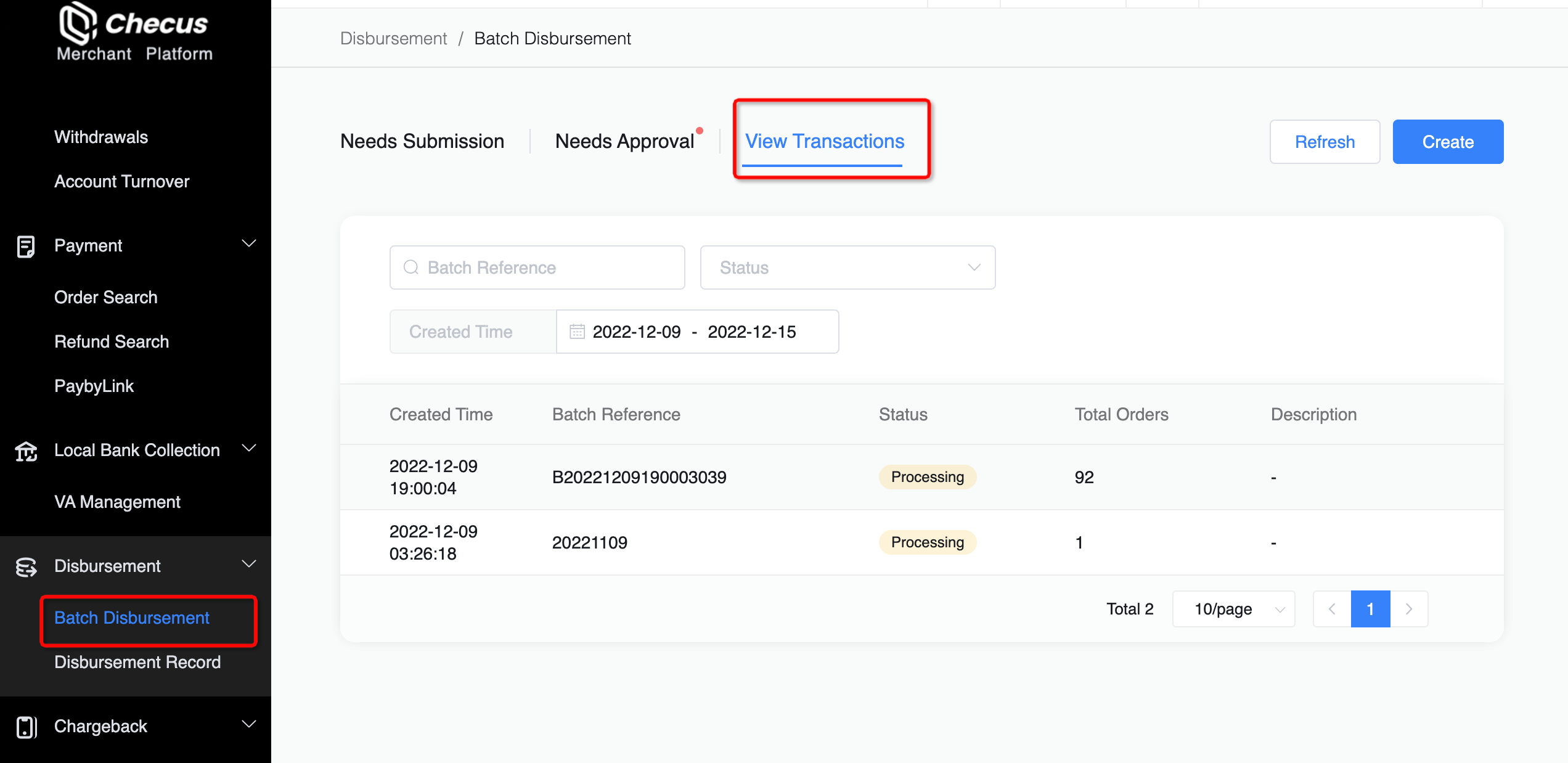 If you initiated a batch disbursement application through the Merchant Portal, individual payment orders will only be searchable after internal approval is completed.