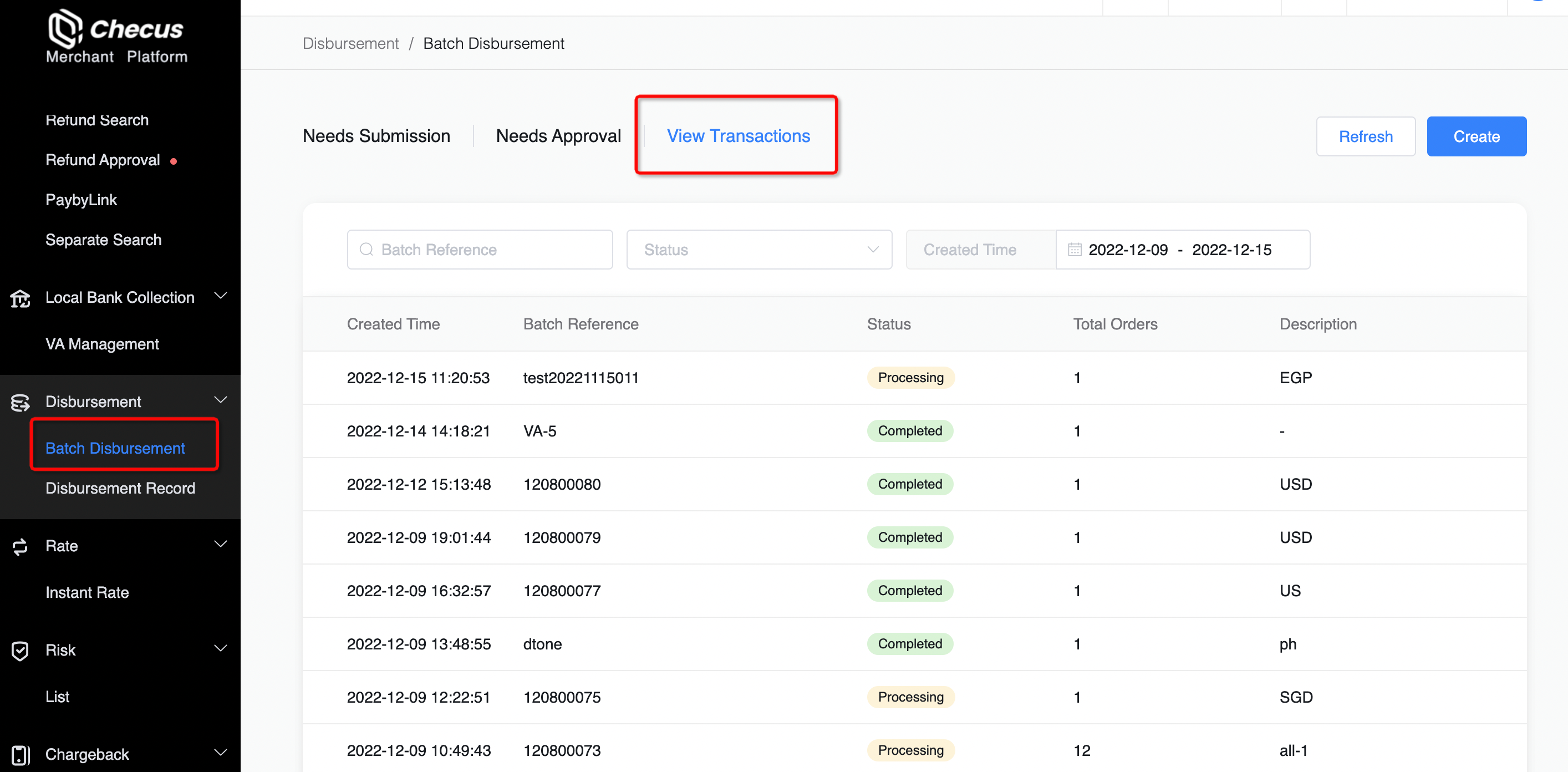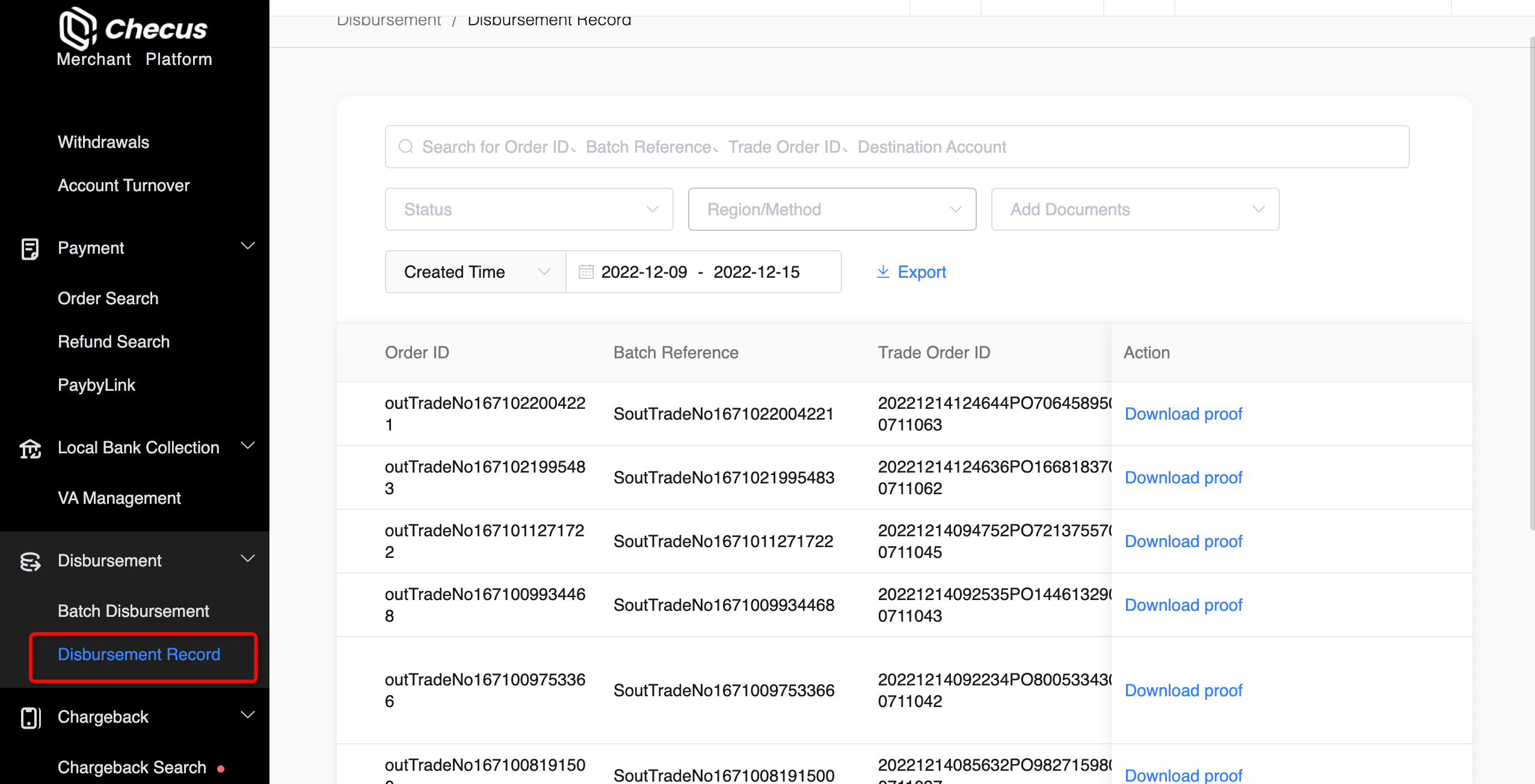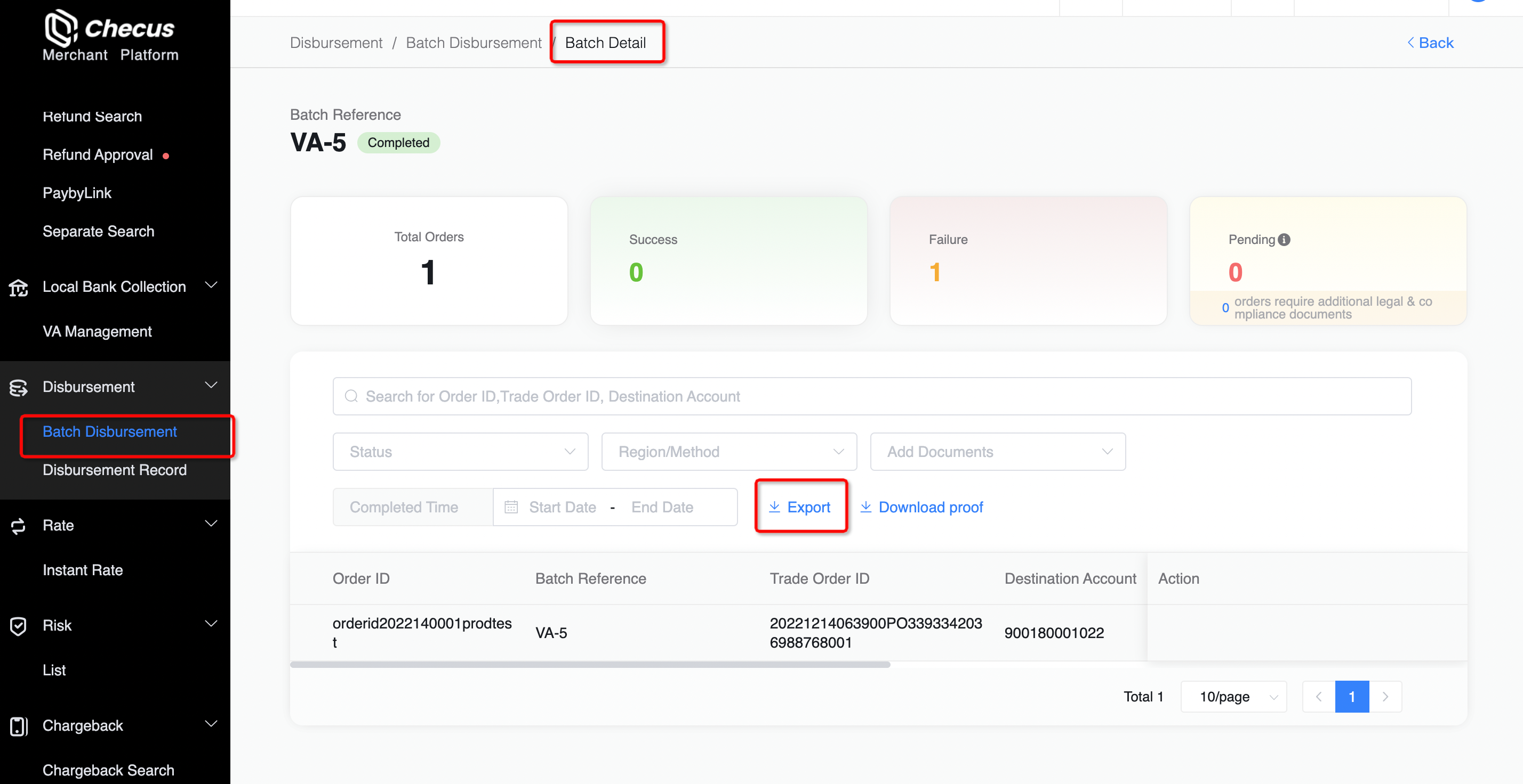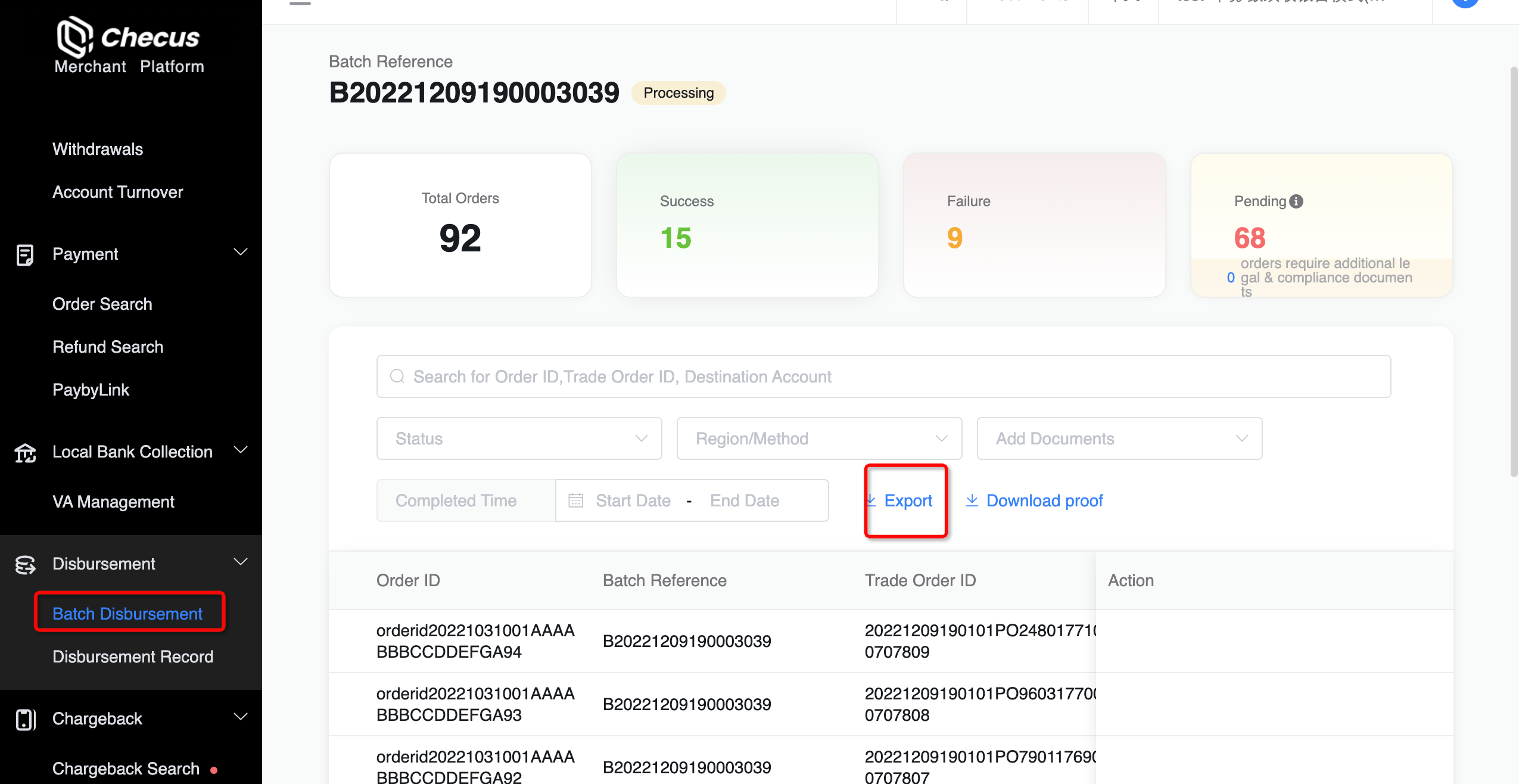 Only payouts initiated via the Merchant Portal can have their batch details viewed and exported. Go to "Disbursement Management" → "Batch Disbursement" → "Order Query", search for and enter the batch details page you need, then click "Export" to export the batch information. You can also click "Voucher Download" to download vouchers for the entire batch.