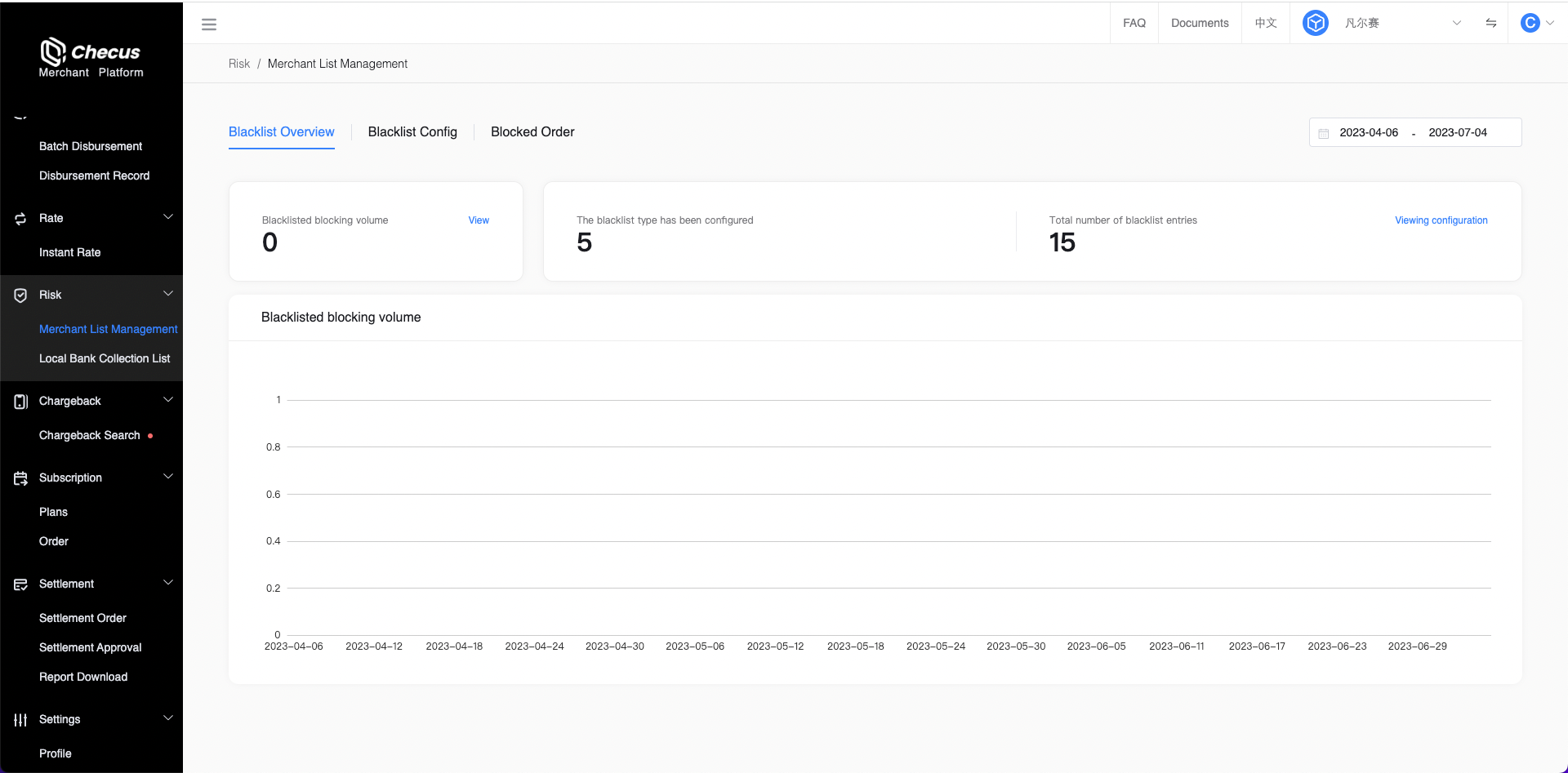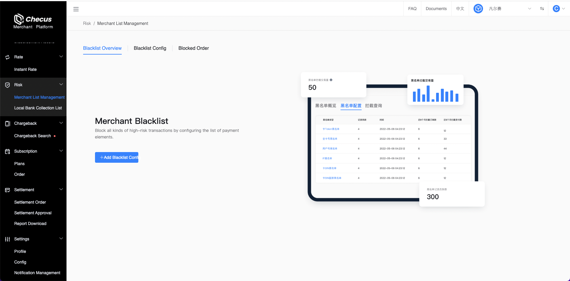 This feature helps merchants mitigate fraud by manually blacklisting suspicious users or card information identified during transactions (e.g., stolen cards, fraud). The feature is located under the left-hand menu "Risk Control Management" → "Merchant List Management". Currently, this menu focuses on blacklist management, with whitelist management to be opened gradually. The page contains three tabs: [Blacklist Overview], [Blacklist Configuration], and [Interception Query].