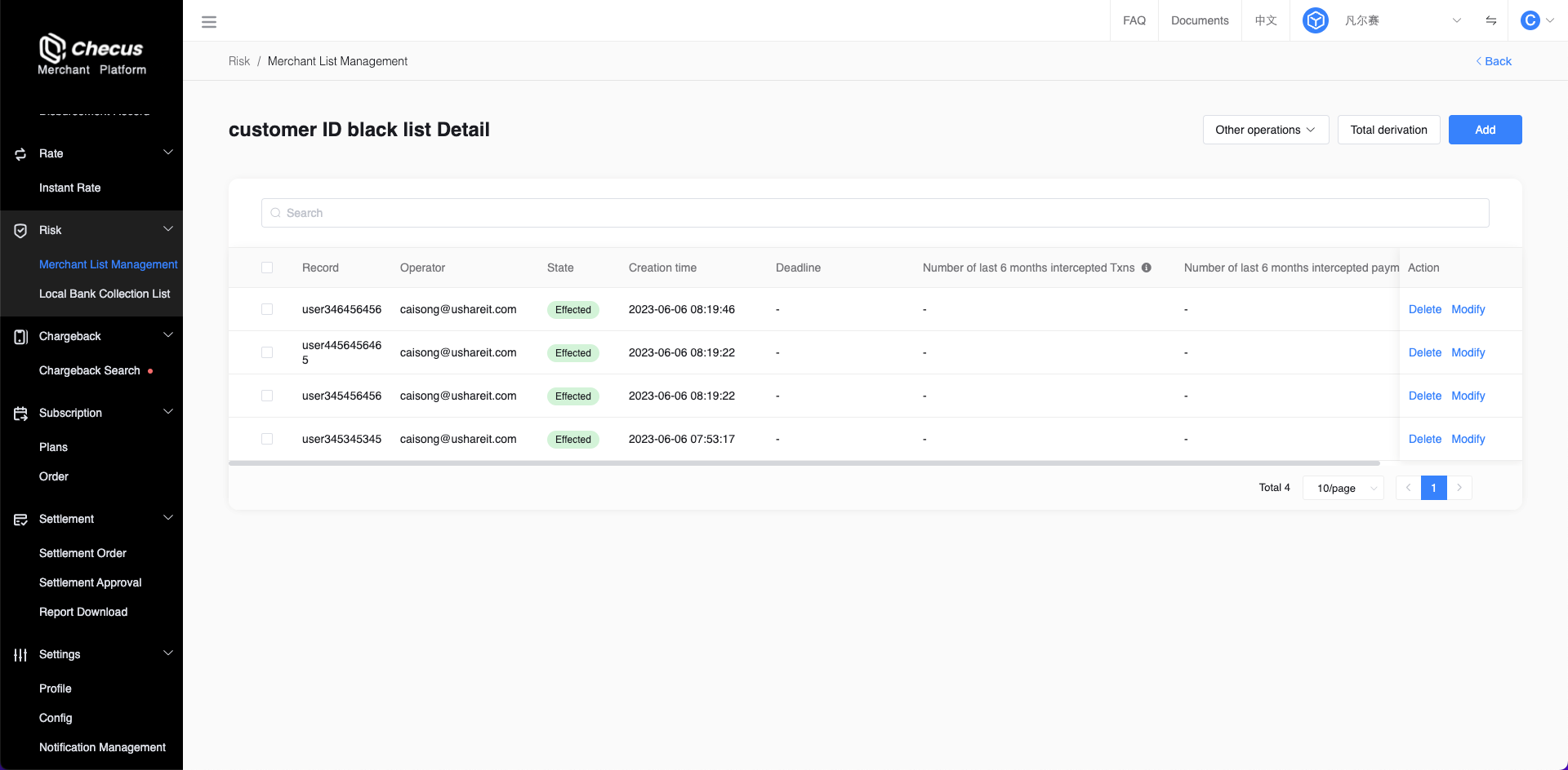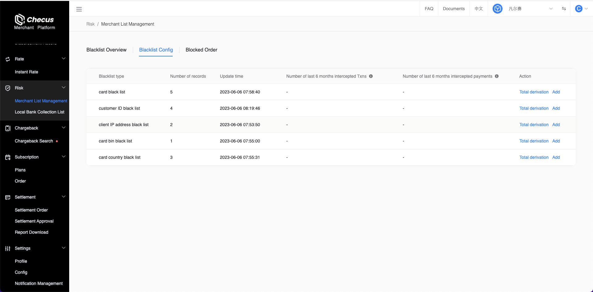 Currently, five blacklist types are supported: [Card Number, User ID, IP, Card BIN, Card BIN Country]. Merchants can input entries manually or import them. Click a list type to view its details and manage each entry.