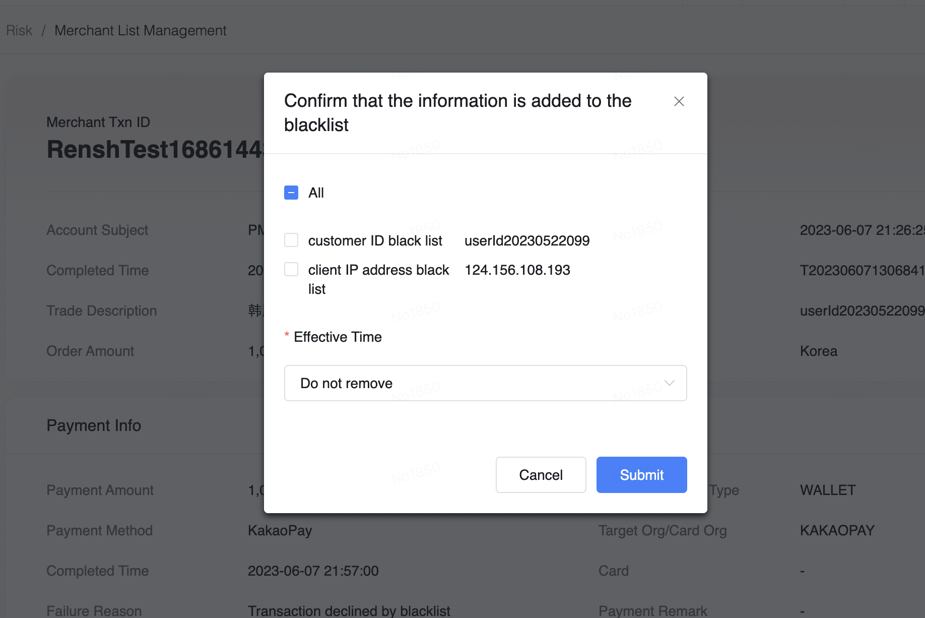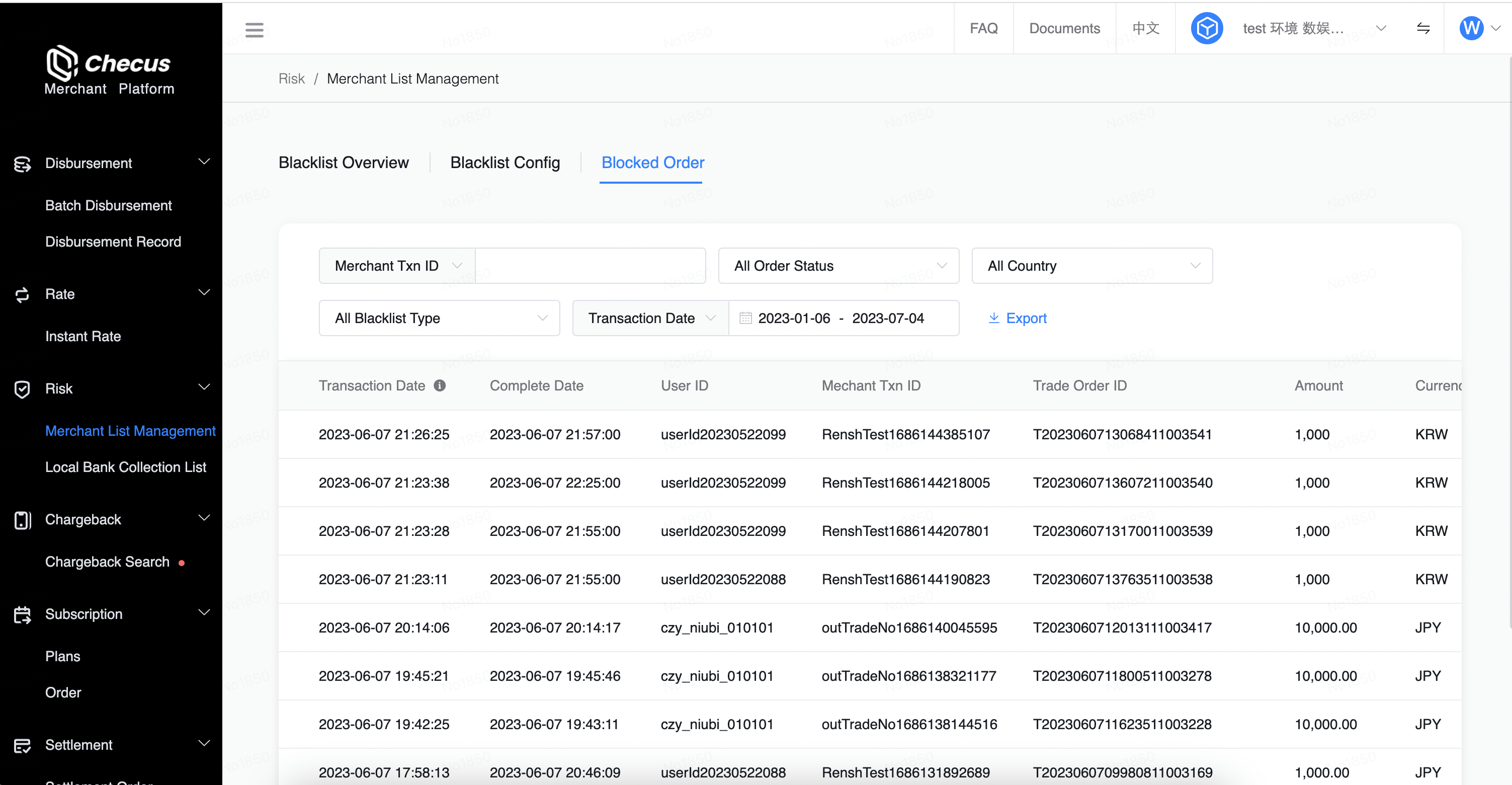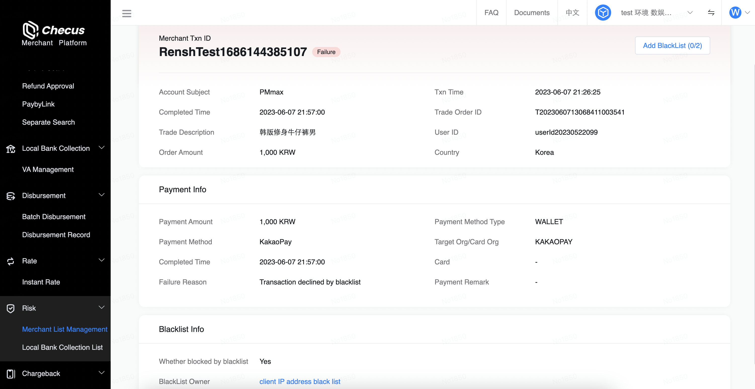 Merchants can view orders intercepted by the merchant blacklist within the last six months. On the Interception Query tab or via "Acquiring Management" → "Order Query" → "Order Details", you can see whether an order was intercepted by the blacklist and quickly add the payment credentials of that order to the blacklist.
