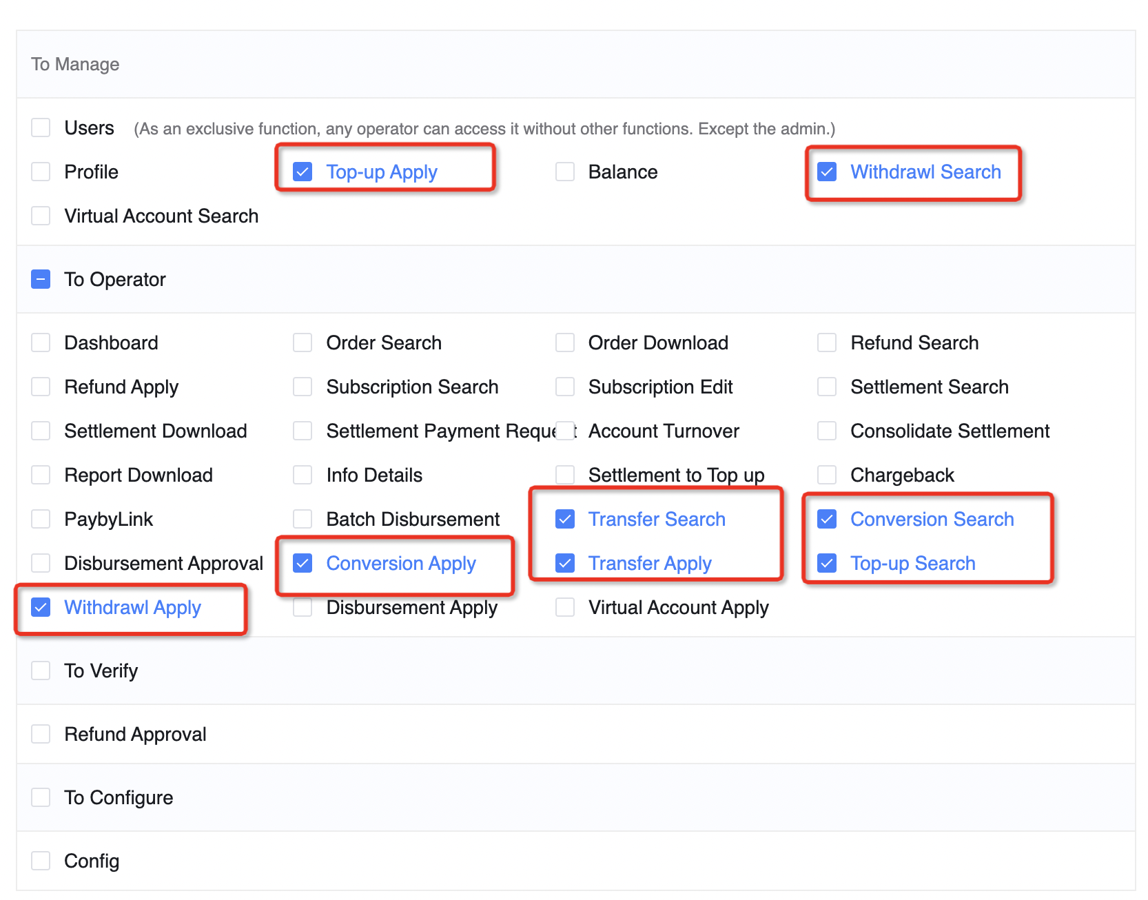 In multi-currency fund management, different businesses have corresponding order inquiry and operation permissions, which administrators can configure individually in Settings Service → Permission Management. *Note: The permission to initiate a business depends on the permission to query that business. For example, to have Top-up Application permission, you must enable Top-up Inquiry permission. The same applies to Transfers, FX Conversion, and Withdrawals.
