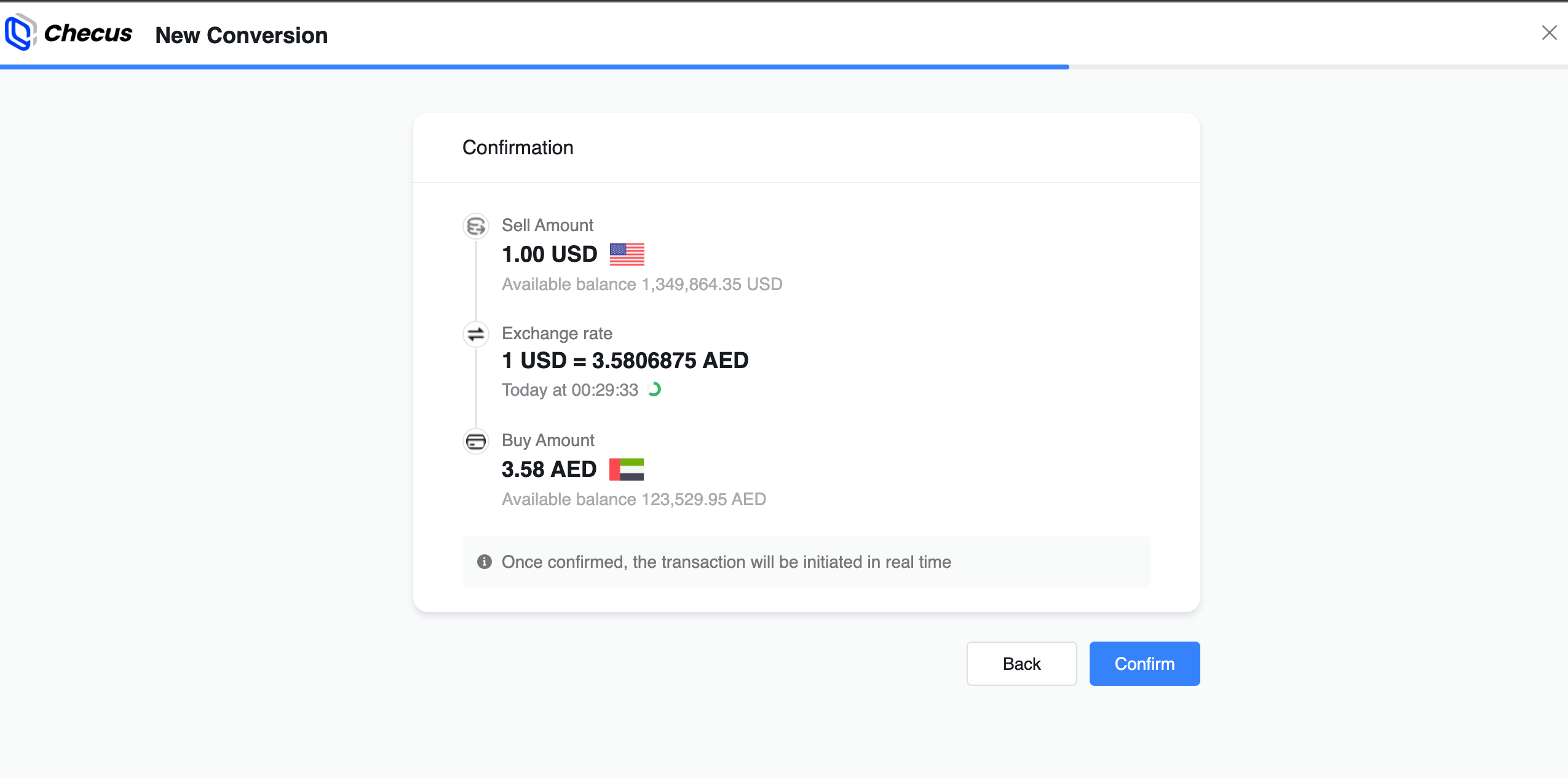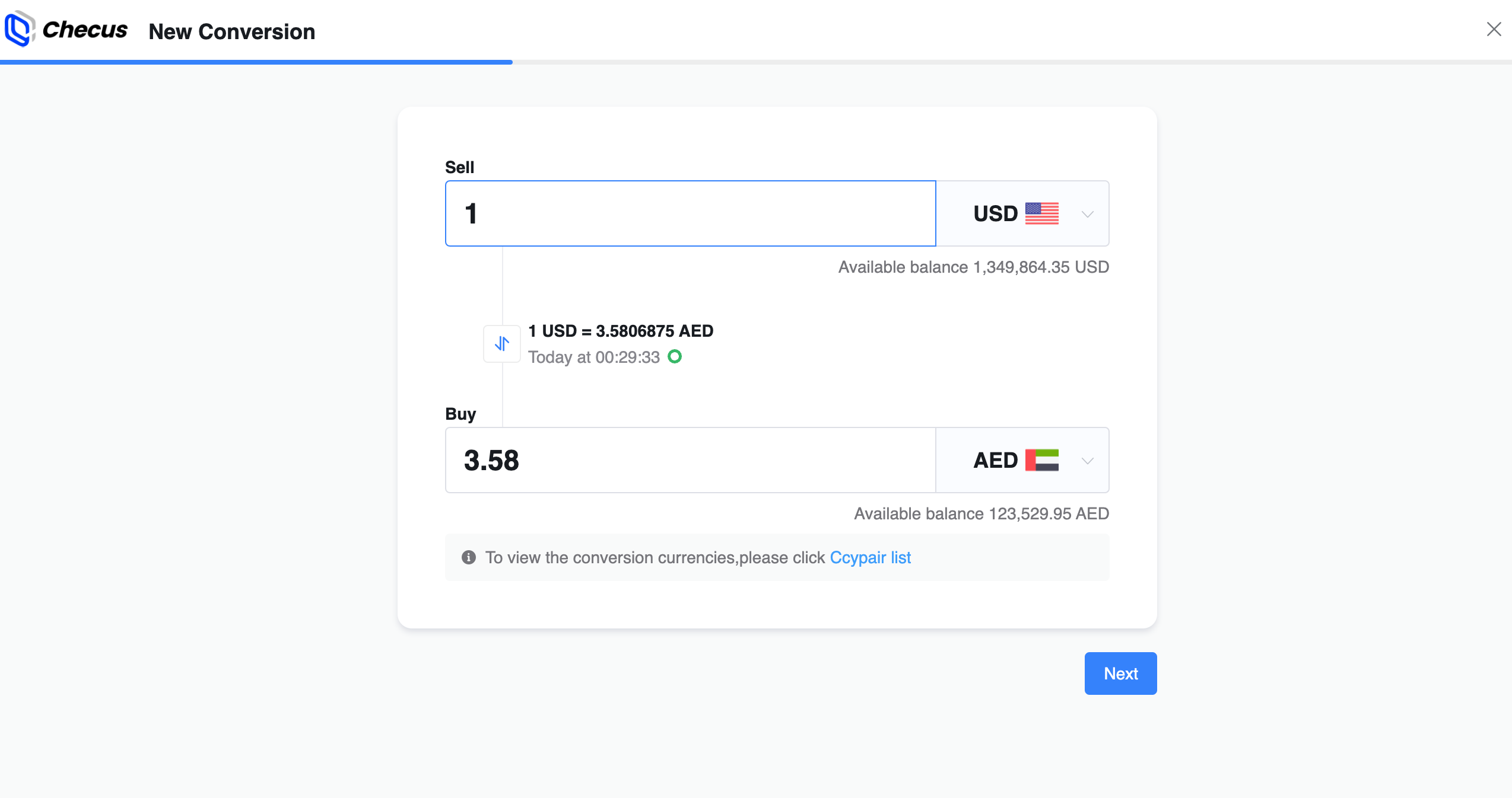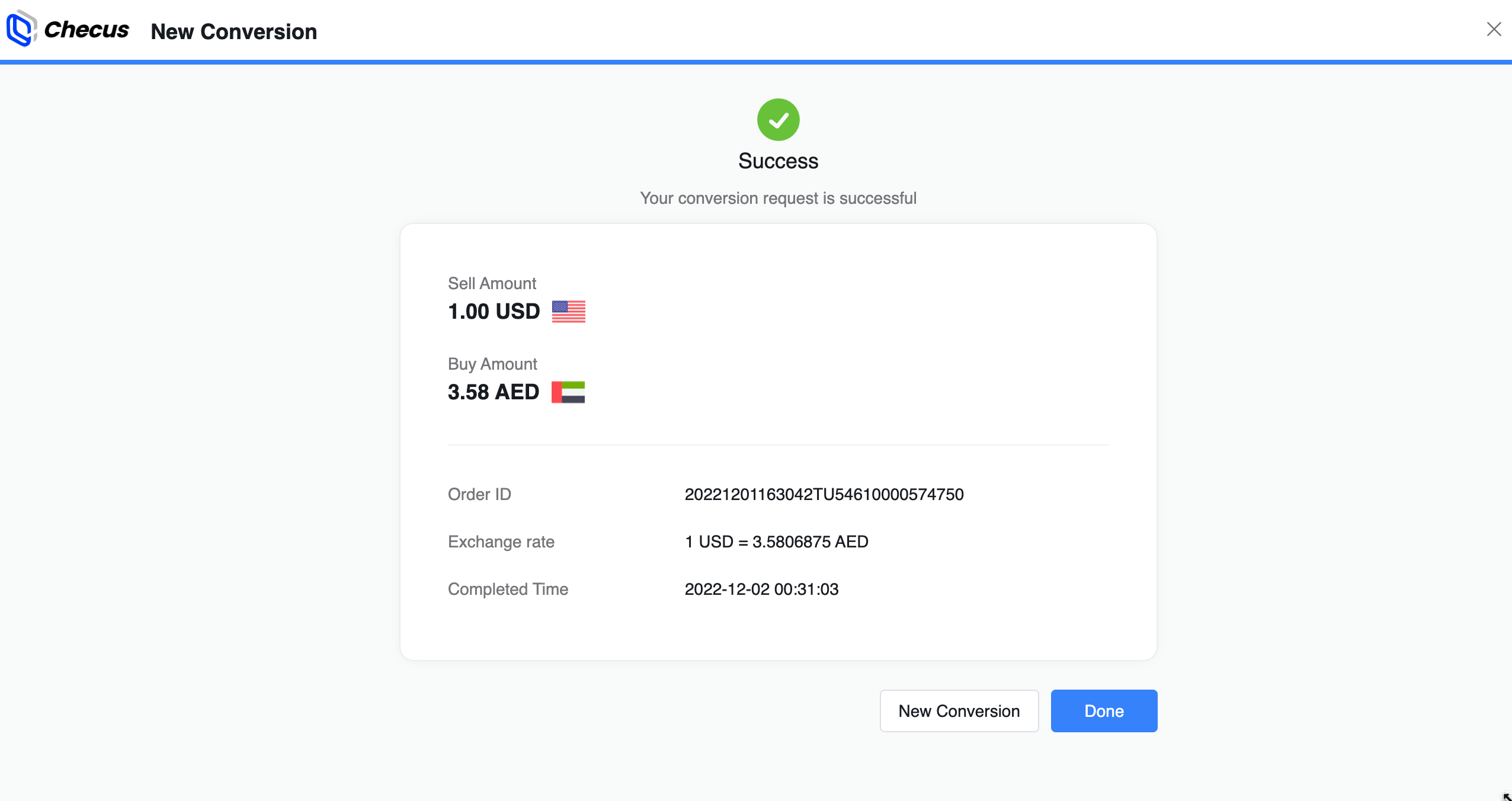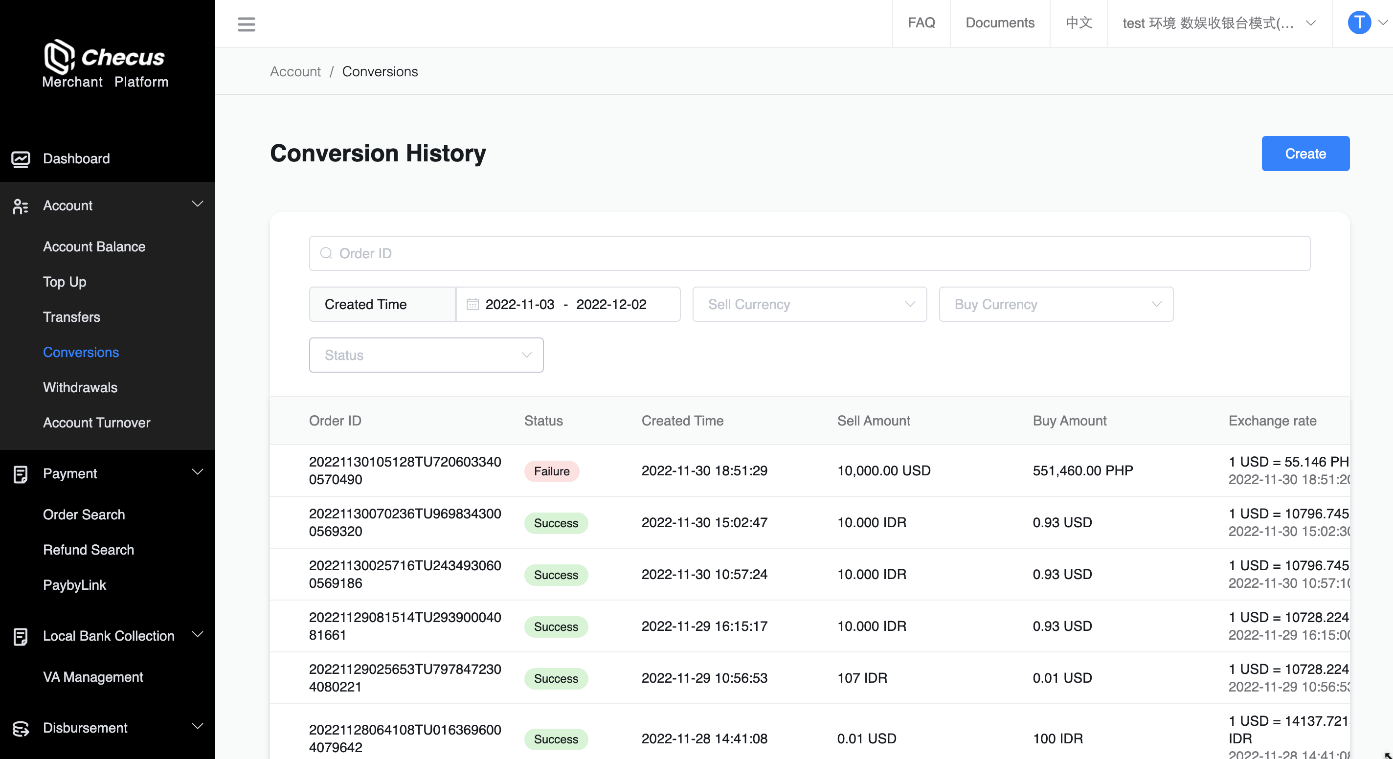 • Processing: After the merchant initiates an FX conversion, the system processes it. If this takes too long, please contact Checus staff. • Success: Processing completed. Funds have been successfully converted between the sell/buy currencies. • Failure: The conversion failed. You can view the failure reason on the page or contact Checus staff for confirmation.