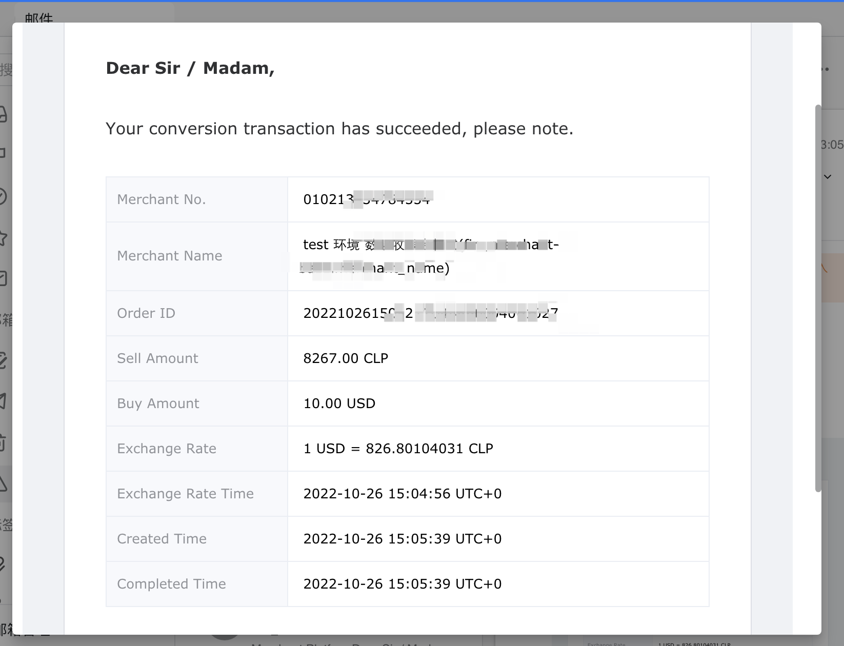 The FX conversion function is used to convert the available balance between different currencies under a merchant (currently only supports one side being USD). The conversion result will be notified to the merchant by email.