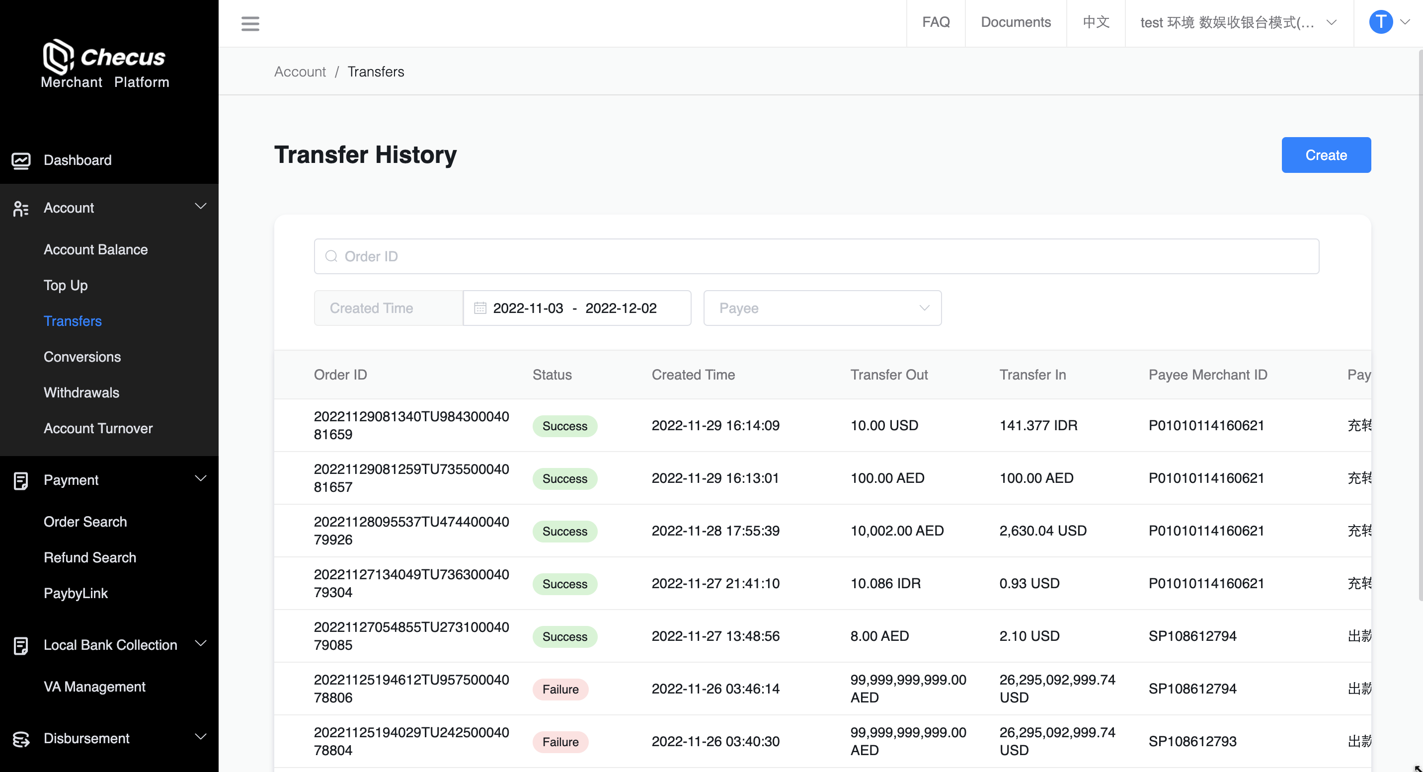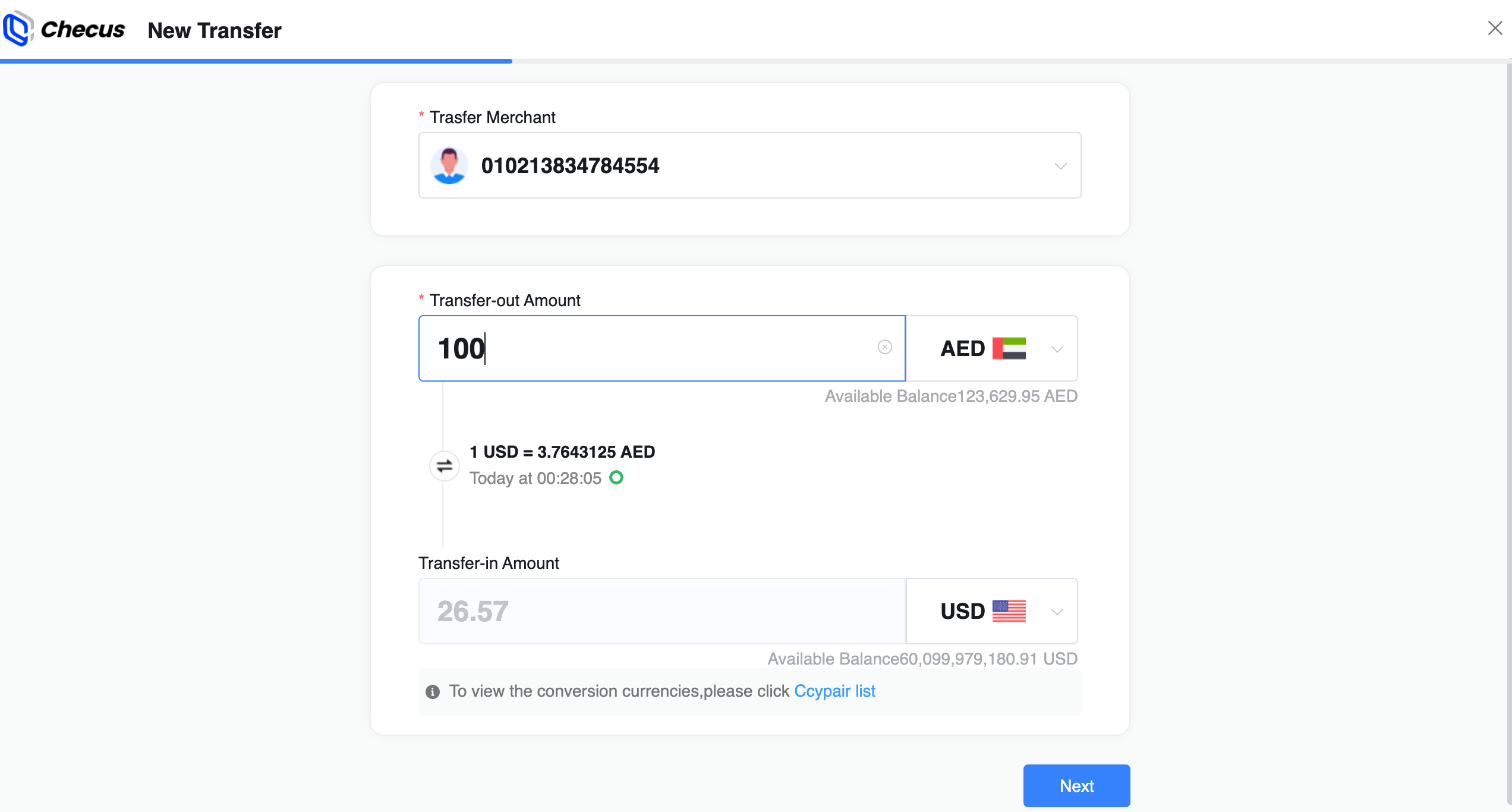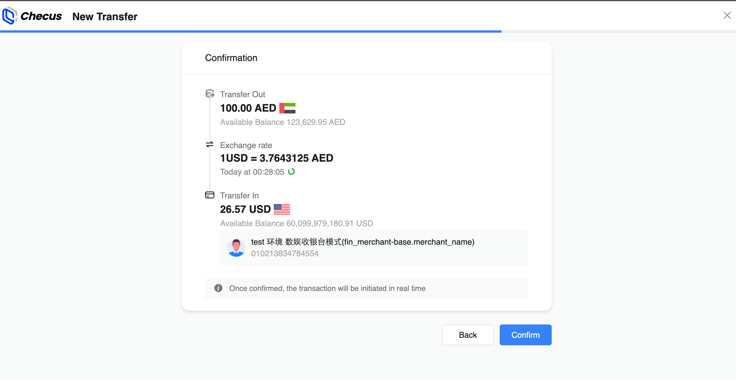 The transfer function is used to reallocate available balances between different merchants under the same legal entity. It supports both cross-currency transfers and same-currency transfers. Same-currency transfers mean the debited currency and the credited currency are the same, with no restriction on currency type. For cross-currency transfers, one side must be USD and the other can be any currency. Direct transfers between two different non-USD minor currencies are currently not supported. If needed, you can convert via the FX function. Transfer results will be notified to the merchant by email.