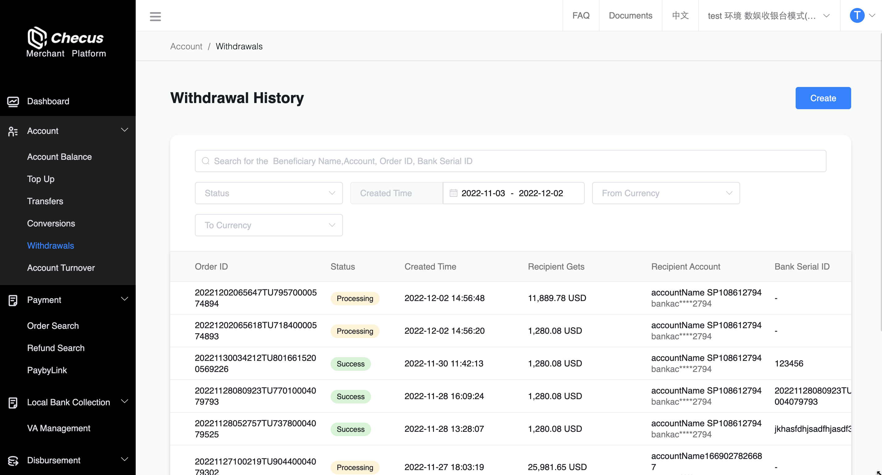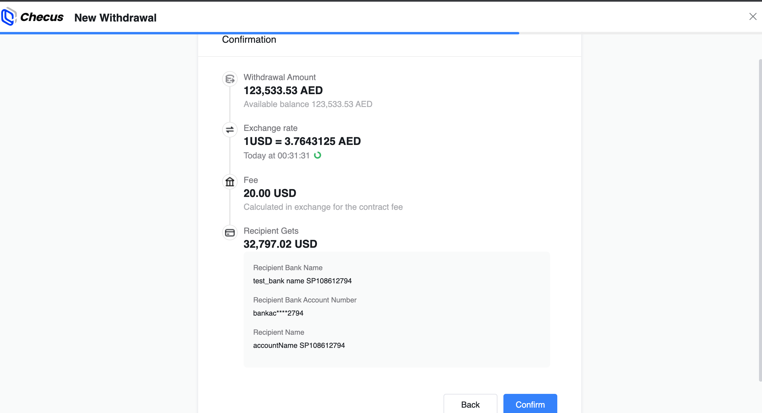 Failure: The withdrawal failed. You can view the failure reason on the withdrawal details page or contact Checus staff for confirmation.