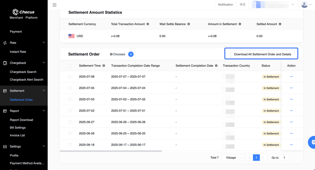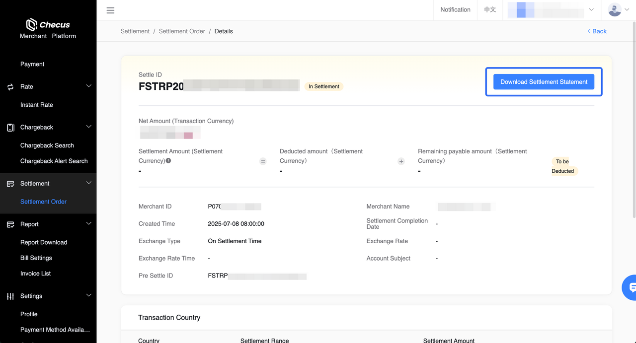 - 'Settlement Management' > 'Settlement Orders', enter the settlement order details page to download the details of the current settlement order.