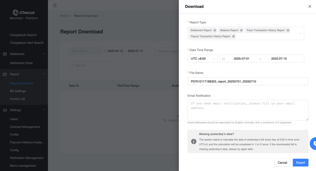 - You can configure recipient email addresses to receive statements. After the file is generated, the system will automatically send a compressed package by email (up to 5 email addresses, separated by commas).
