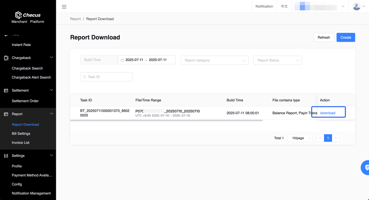 After the statement is generated, the file status will be displayed in the list. You can click the Download button to save the statement package locally.