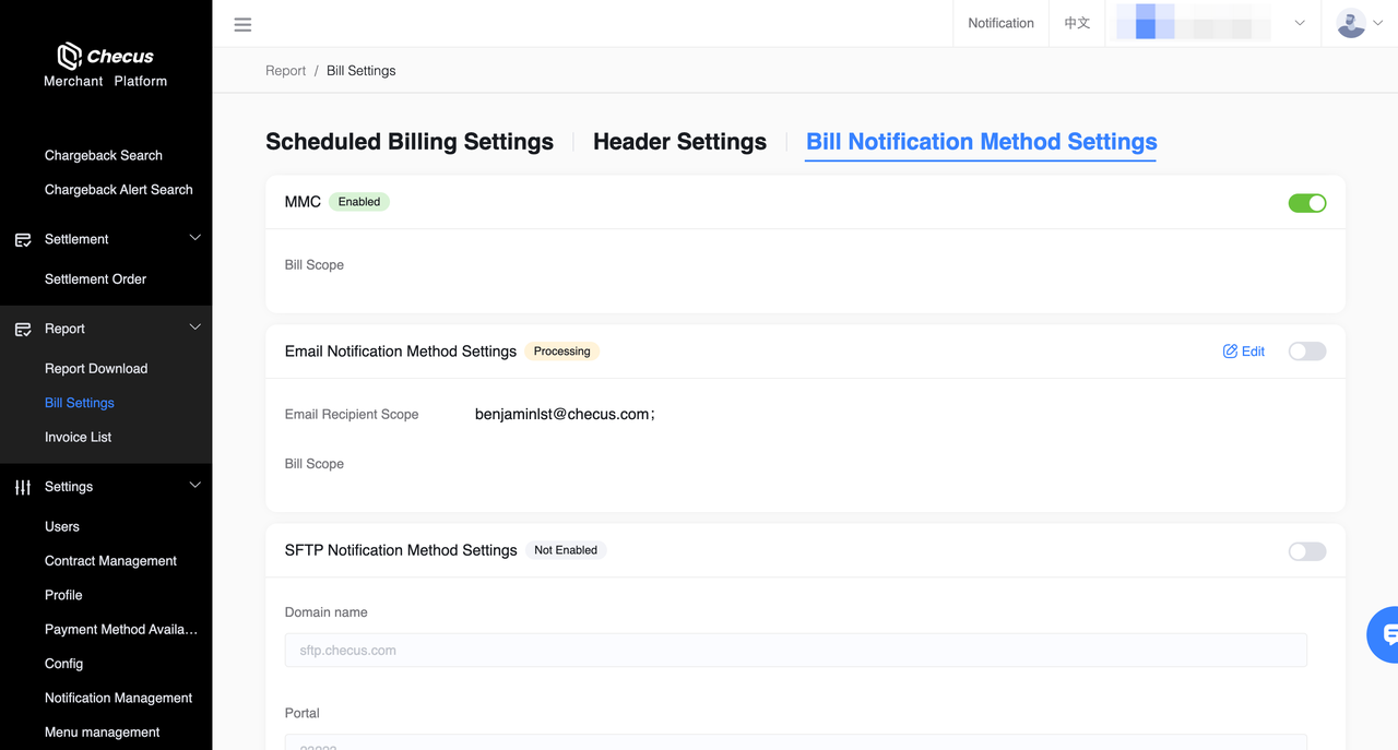 ⚠️ Only merchant administrators can configure notification methods, and at least one notification must remain enabled. SFTP notifications are preset based on agreements with the platform and currently do not support self-service switching.