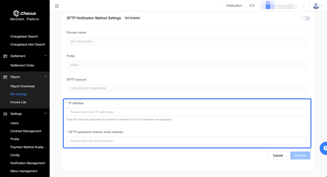 - You can self-apply for permissions through - 'SFTP Notification Settings'. Toggle the switch in the upper right corner and fill in IP address and SFTP password recipient email. After confirmation, a ticket will be automatically created and technical support will complete approval and activation.