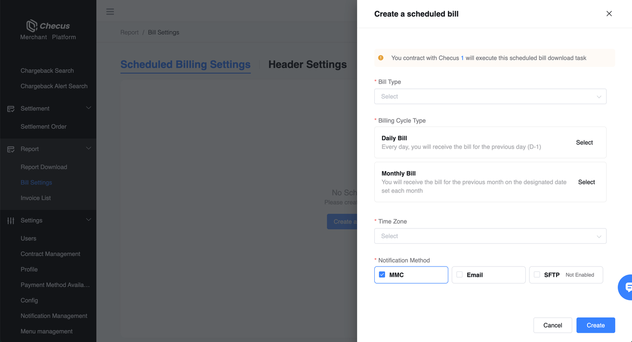 - Select the statement type, generation cycle (daily or monthly), statement time zone, and notification method. Click Create to save, and the settings will take effect.